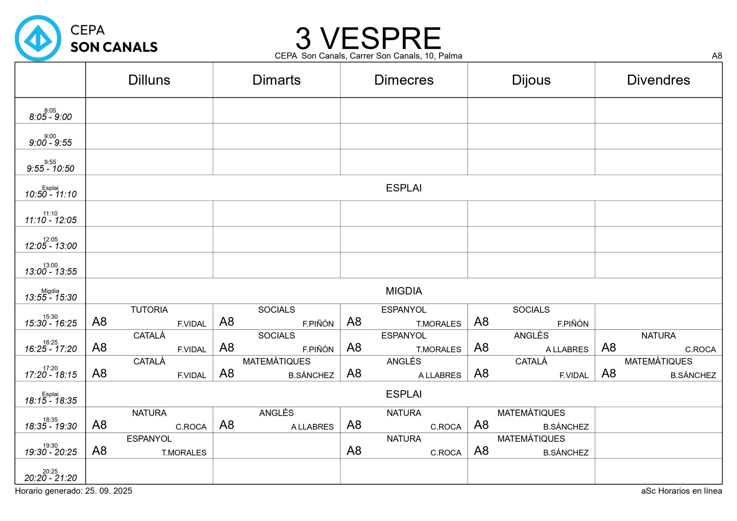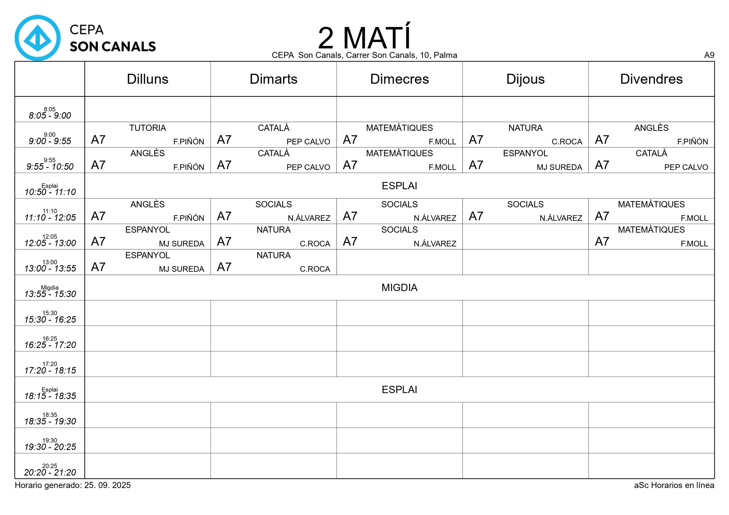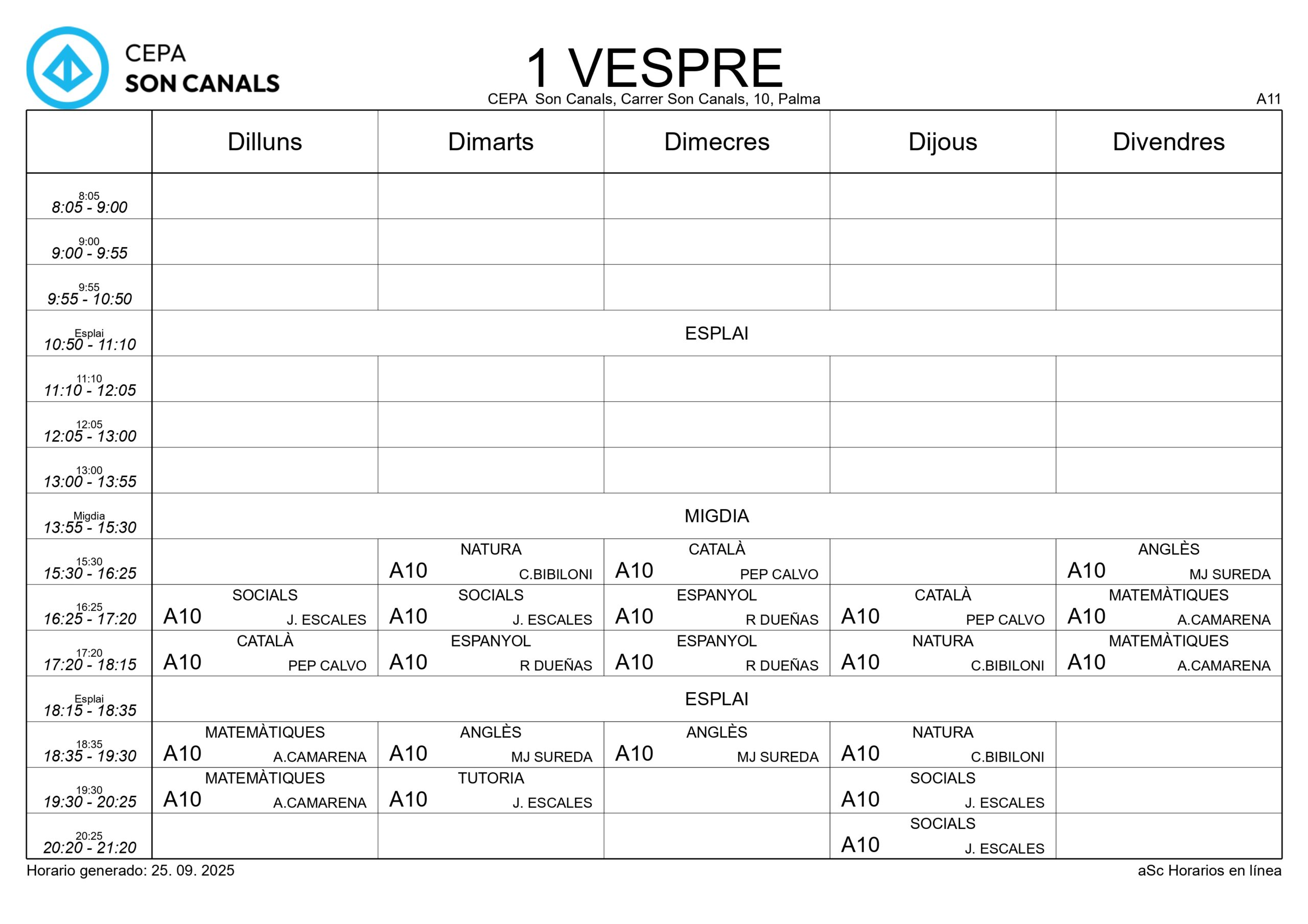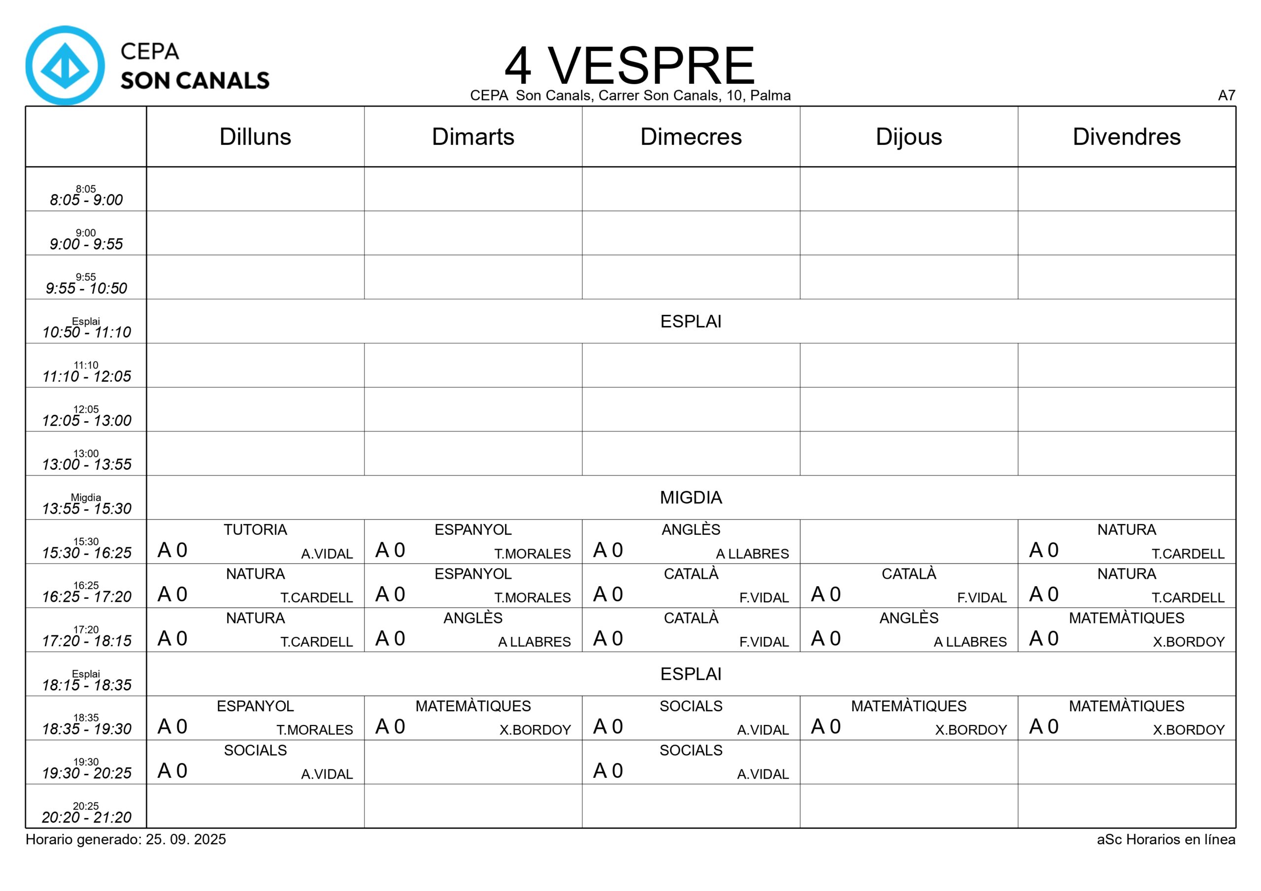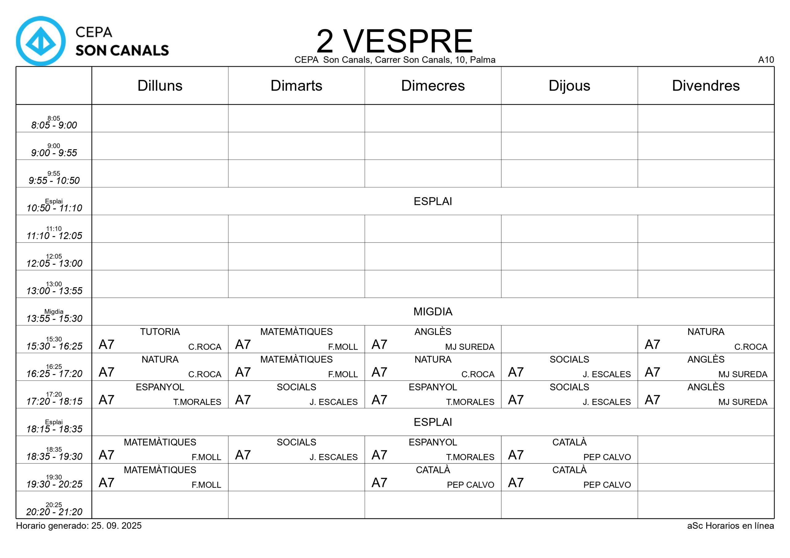 - Torn de capvespre 🌆 – Dos dies a la setmana, amb horari general de 15:30 a 20:30 h *.