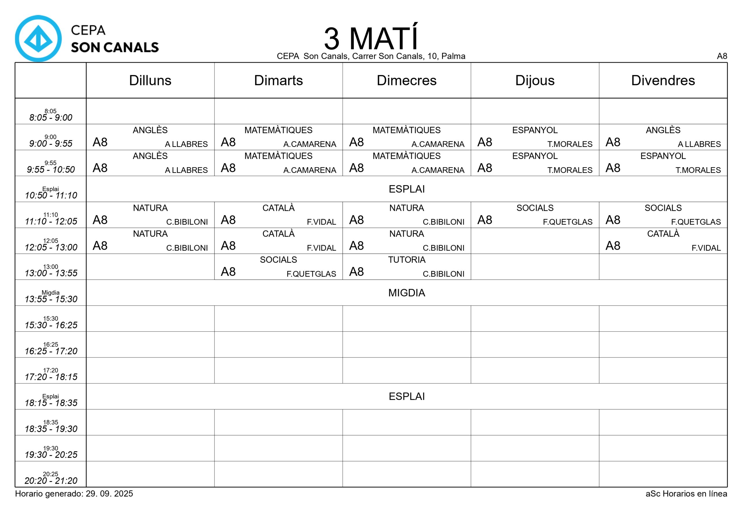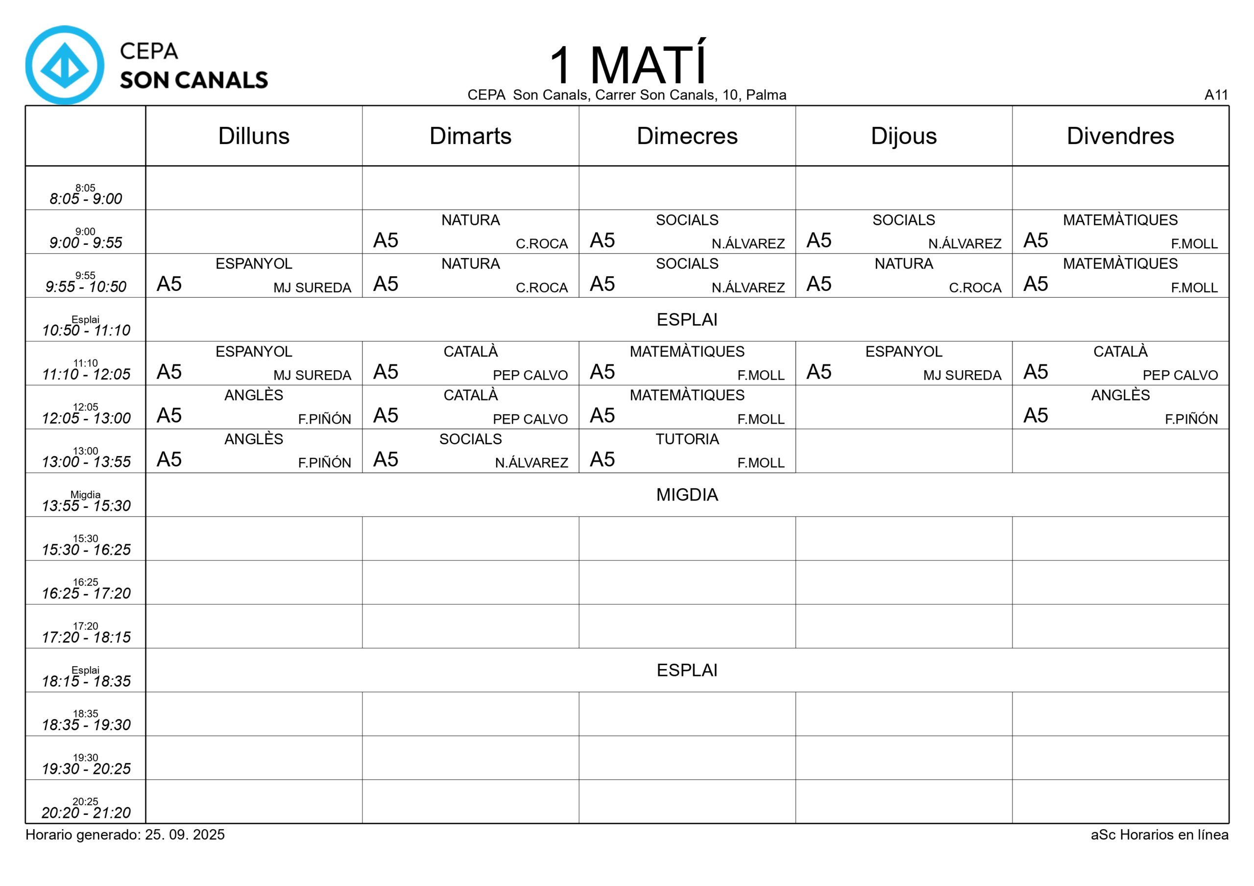 * Planificació concretada, segons el grup, pels horaris indicats a continuació ().