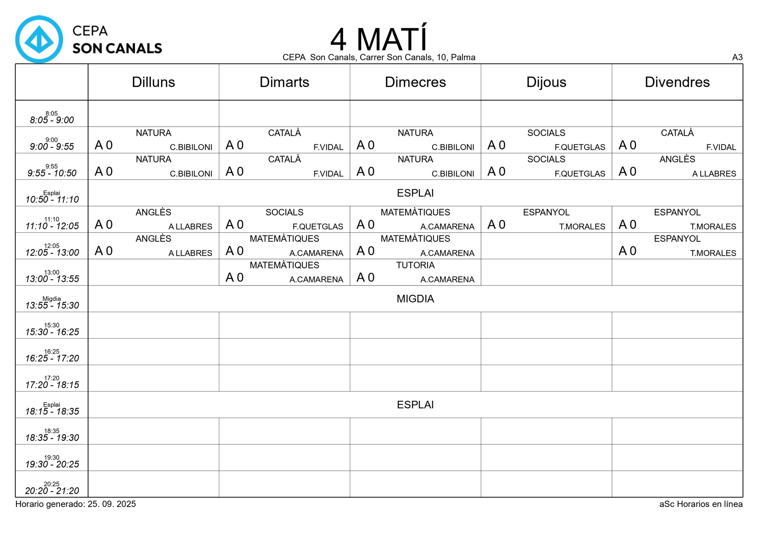 Total d’hores lectives: ~360 hores (20 hores/setmana, 18 setmanes) per nivell.