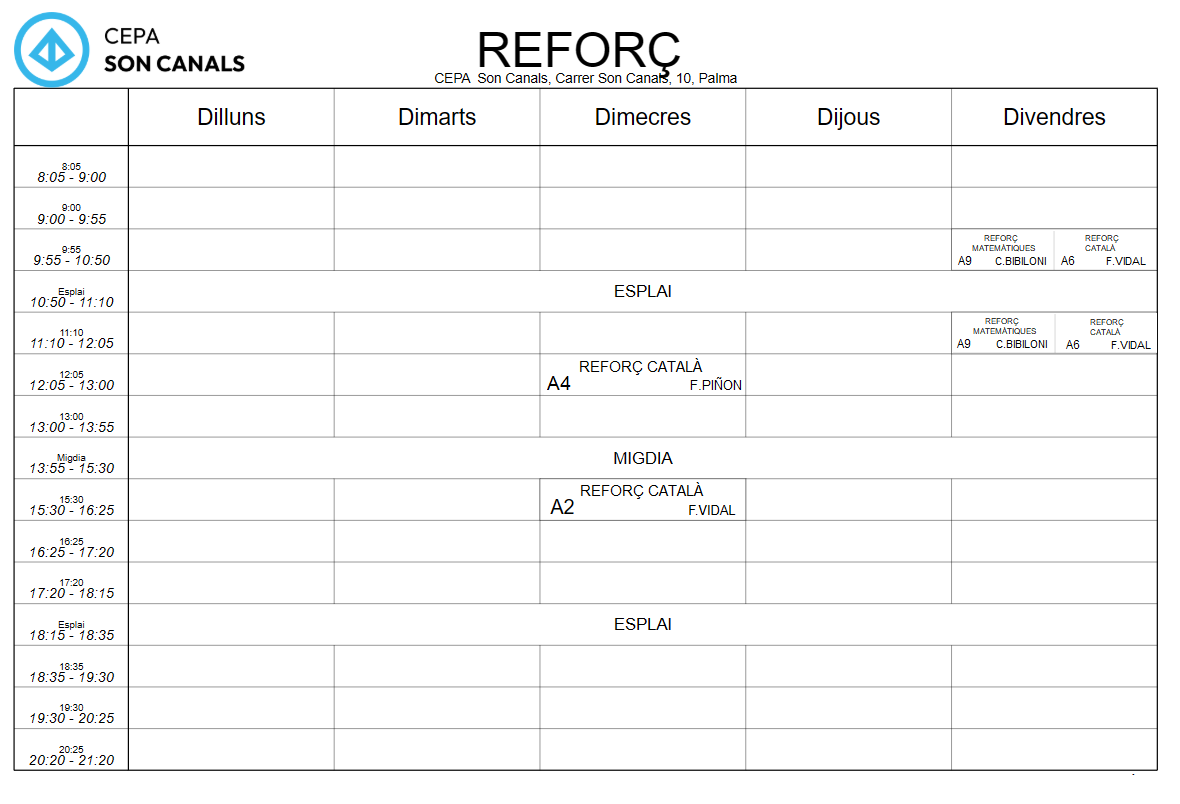 - Dilluns: 18:30 a 20:30 (Antoni Vidal)